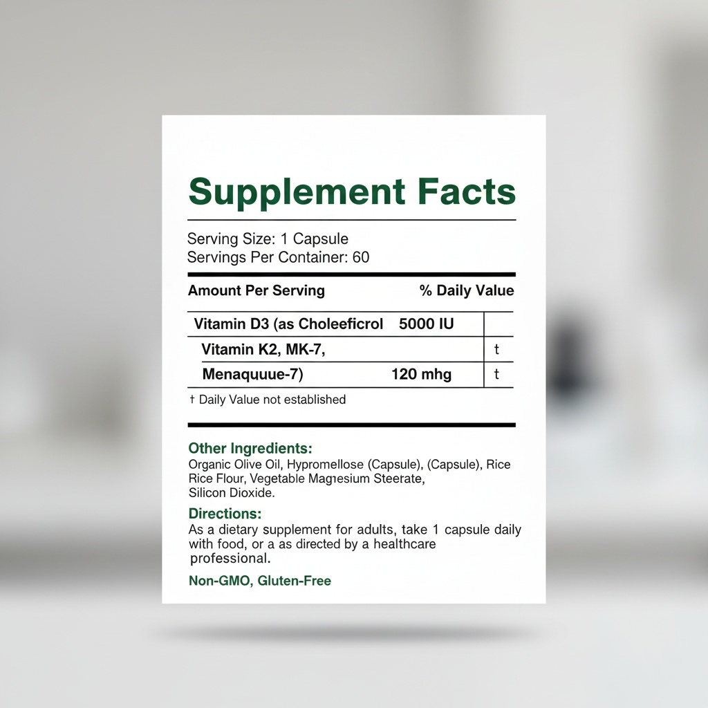 Vitamin D3 (Cholecalciferol – 5000 IU), Vitamin K2 (MK-7), Organic Olive Oil, Hypromellose Capsule, Rice Flour, Vegetable Magnesium Stearate, Silicon Dioxide.